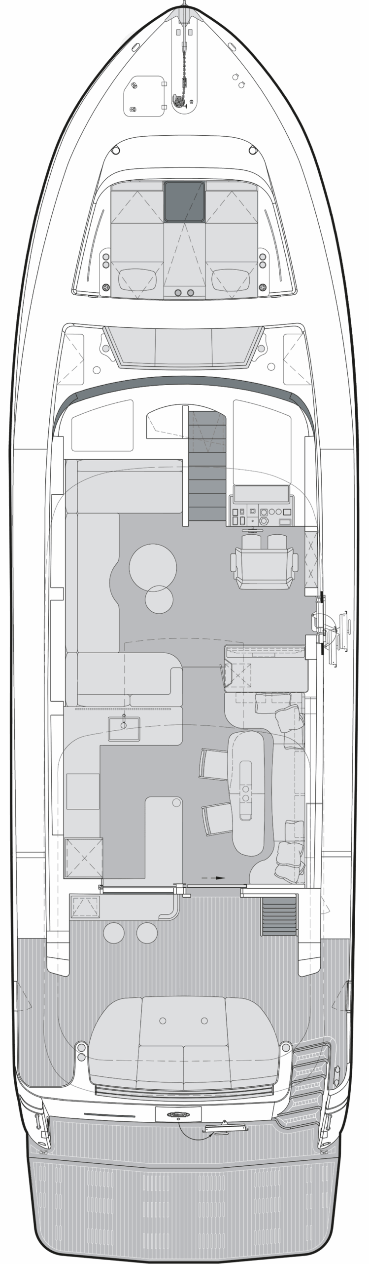 Where elegance meets innovation, the new CLB65 SUV boasts a thoughtfully designed layout, complete with expansive wraparound windows and a retractable rooftop that invites an immersive connection to nature. Revel in stunning views from the Aft Lounge with a refreshing cocktail in hand or find serenity in the Fore Lounge – every detail is crafted to elevate your experience. Situated seamlessly between the Aft Lounge and the salon, the fully equipped galley, complemented by two chic bar stools, beckons guests to indulge in a delightful culinary adventure.